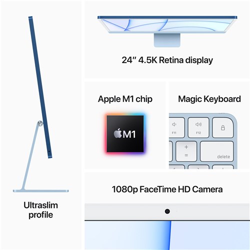 You’ve never seen a computer like this before. With a strikingly thin design made possible by the Apple M1 chip. An immersive 24-inch 4.5K Retina display with over a billion colours that gives you the big picture in stunning detail.1 The best camera and mics ever in a Mac so you look and sound your best. And room-filling. six-speaker sound that takes movies and music to the next level. It works seamlessly with iPhone so texts and calls go straight to your iMac. And with a spectrum of colours to choose from. it’s the all-in-one that’s all yours.