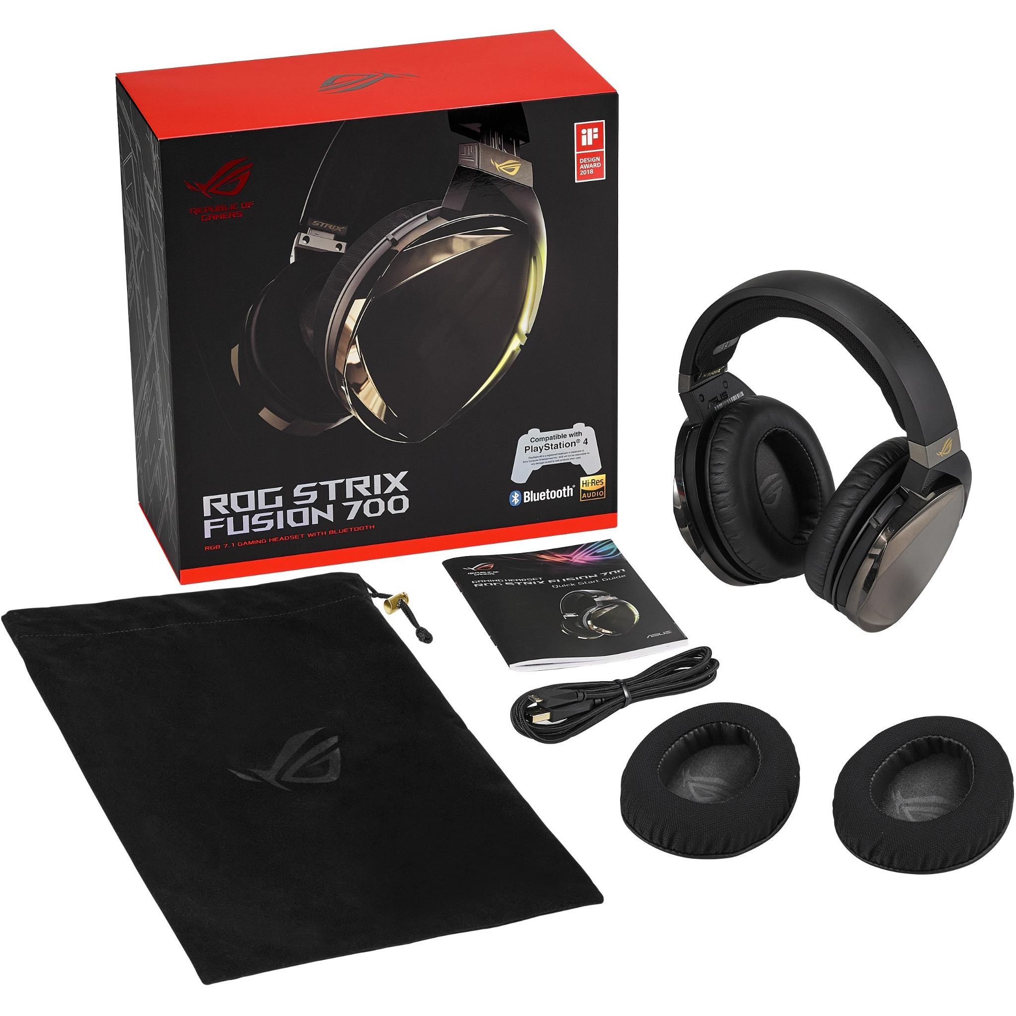 ROG Strix Fusion 700 is a gaming headset that offers versatile connectivity. with USB 2.0 for wired gaming on your PC. PlayStation 4 and Nintendo Switch. and Bluetooth 4.2 for you to pick up VoIP and phone calls or listen to your favorite music wirelessly and effortlessly.