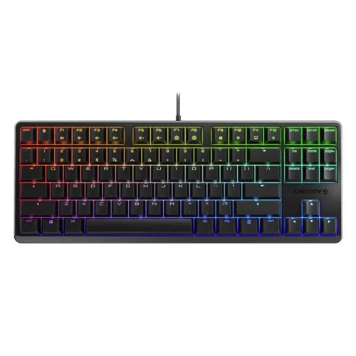 The CHERRY G80-3000 S TKL is a classic corded keyboard with a reduced key layout for more desktop space. A classic that meets all today’s requirements for a TKL version. The CHERRY MX Gold Crosspoint precision switches. made in Germany with full n-key rollover. anti-ghosting and a WIN key lock give you the CHERRY gaming standard you expect. The RGB versions have impressive integrated RGB illumination in more than 16 million colors. Numerous color routines and illumination modes are simple to use with the freely downloadable software. Use the CHERRY button to quickly access the software. The lasered key caps are completely abrasion-resistant – for the highest demands and heavy-duty gaming. Durable. precise and reliable thanks to the MX switches used in millions of devices. Available in various switching characteristics and colors. Focused on the essentials – focused on what you want!