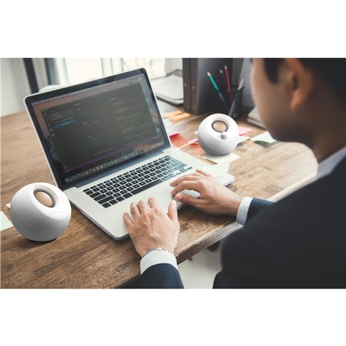 Personifying an element of zen. the compact Creative Pebble offers a clean minimalist look that fits neatly into almost any desktop setup without taking up too much space. Featuring dual far-field drivers set at a 45° angle and passive radiators. the Pebble delivers crystal clear audio with bass and an elevated sound stage.