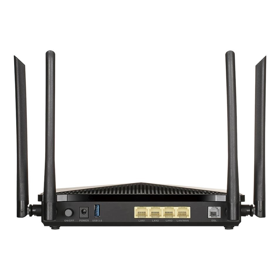 The DSL-245GE uses the latest Wireless AC technology. which provides transfer rates of up to 1.2 Gbps1 (866 AC + 300 N). The router operates on both the 2.4 GHz and 5 GHz wireless bands at the same time using concurrent dual-band technology and two external antennas. This allows you to browse the web. chat. and e-mail using the 2.4 GHz band. while simultaneously streaming digital media. playing online games. or making Internet voice calls on the 5 GHz band.