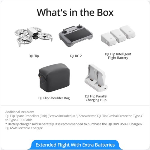 The DJI Flip Parallel Charging Hub [10] allows you to charge two batteries simultaneously. [11] significantly reducing charging time so that you don't miss any exciting moments.