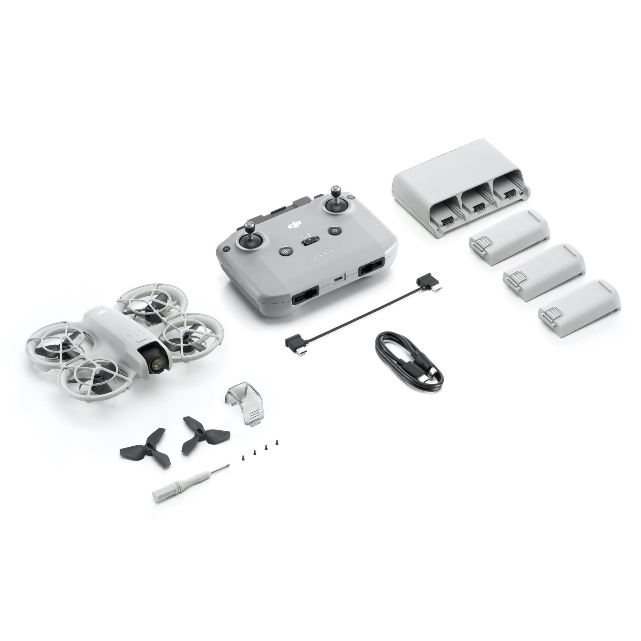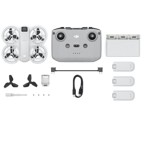 The DJI Neo Fly More Combo includes the aircraft. an RC-N3 Remote Controller. three intelligent batteries. a two-way charging hub. and more. providing superior flight control and camera operation. for everyday to precise aerial creation.