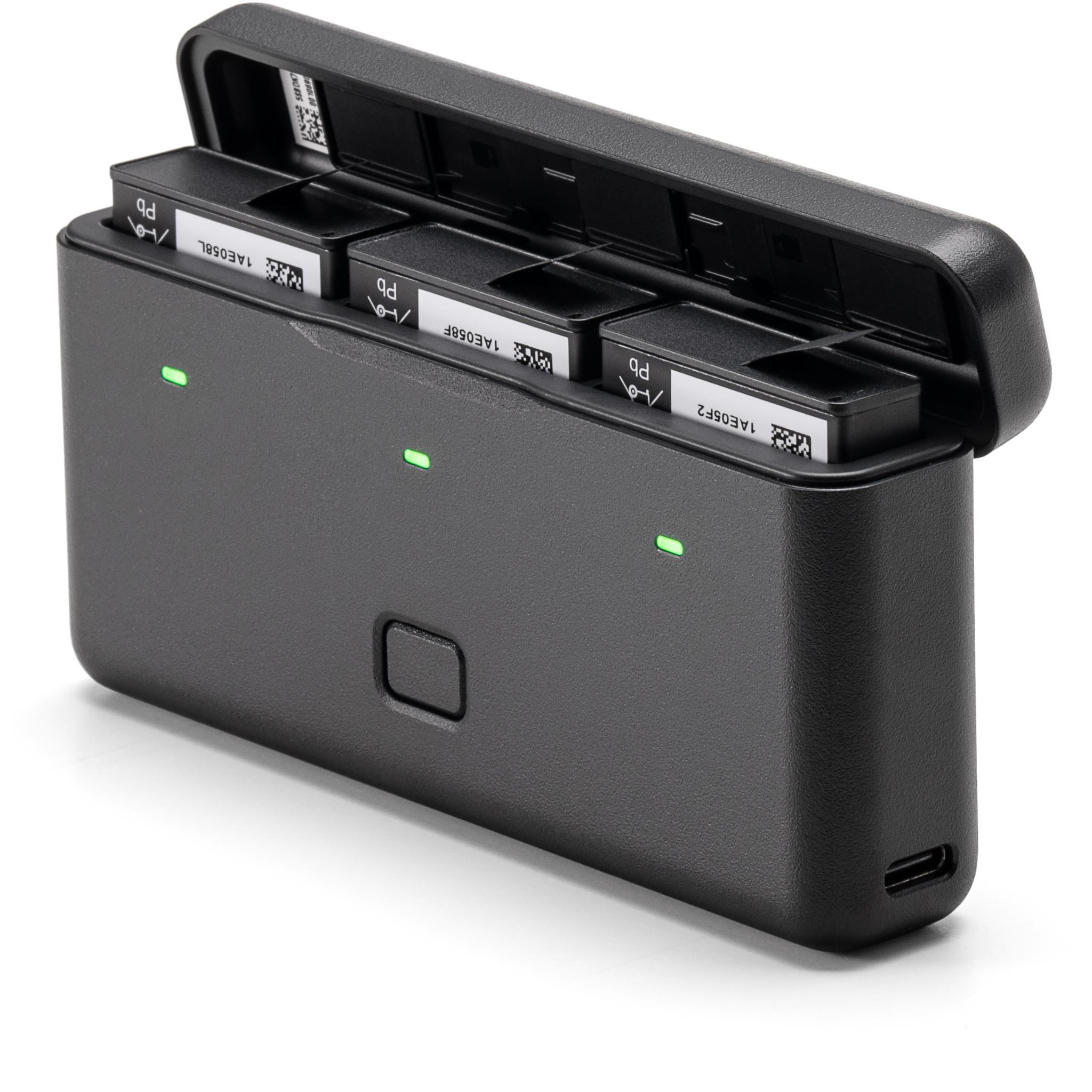 Stores three batteries and two microSD cards*. Intelligently fast charges three batteries. and can be used together with those batteries as a power bank to charge other devices like a smartphone.