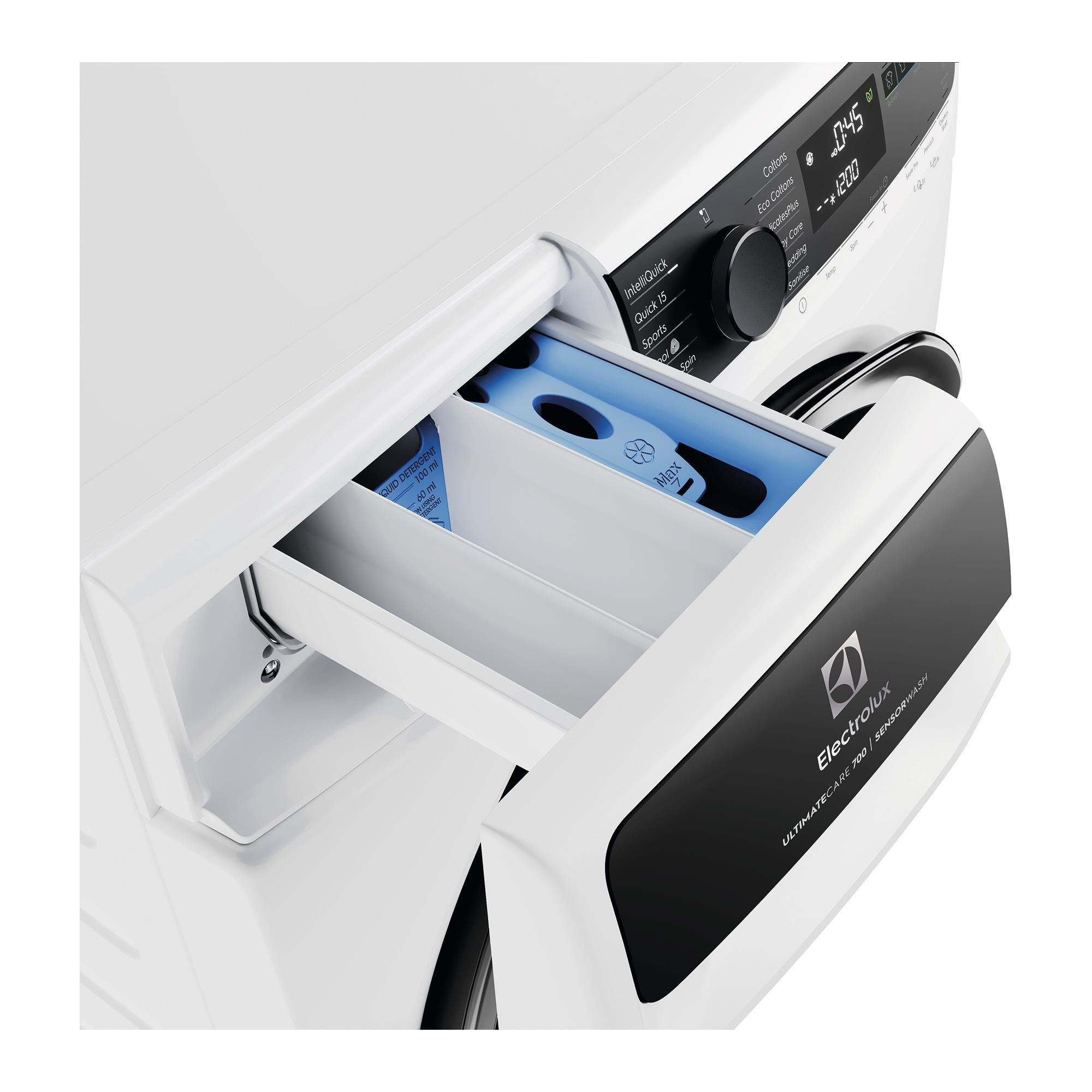 Wash a 10kg load in just 45min thanks to its IntelliQuick cycle. Its UltraMix technology thoroughly dissolves detergent. preventing visible residue on your clothes. Enjoy its SmartSelect UI. allowing you to adjust washing based on your needs and guiding you save energy. time and water. The Woolmark Blue programme is as gentle as handwashing for your delicate woollen garments.