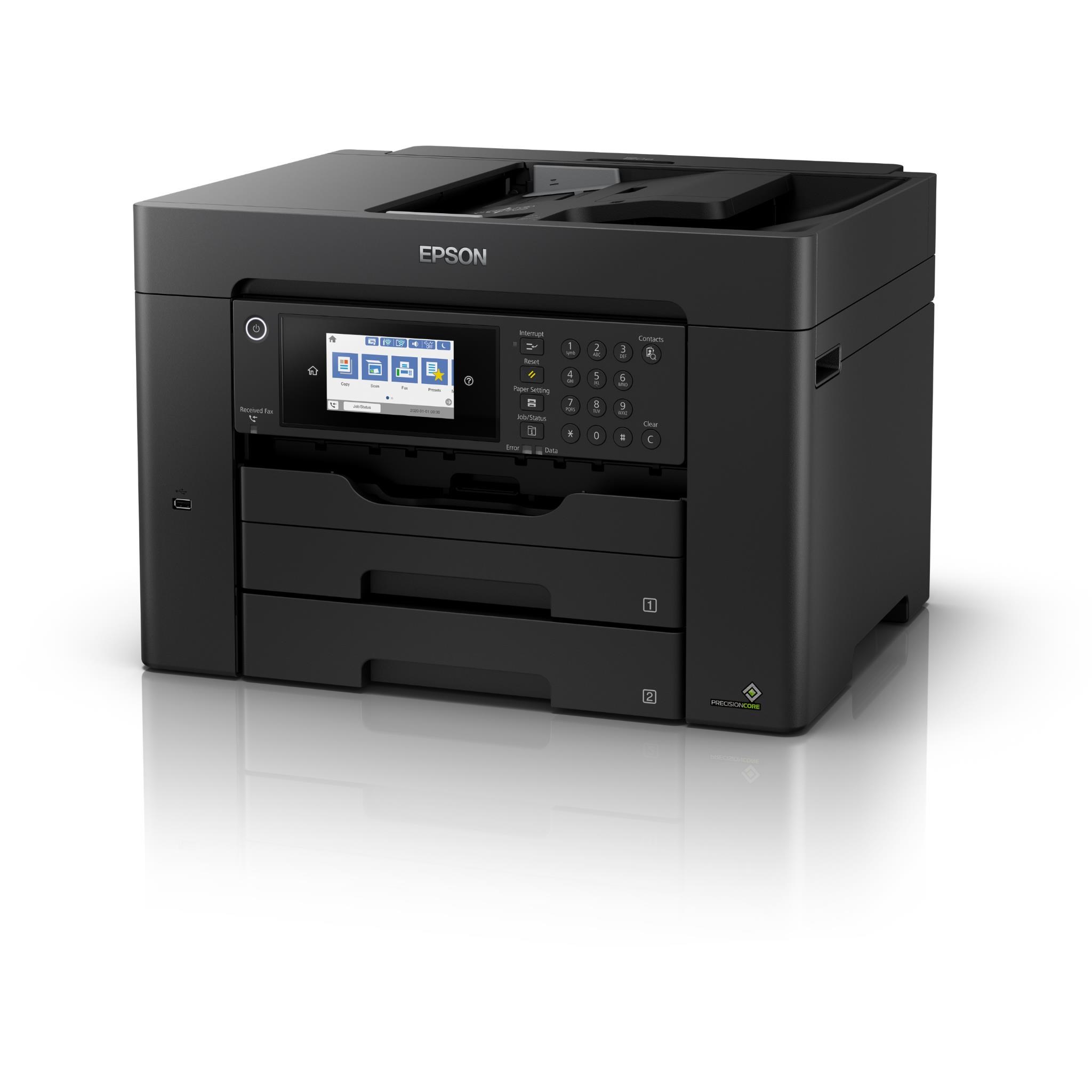 Powered by PrecisionCore®. Heat-Free Technology the WorkForce WF-7845 all-in-one printer quickly produces high quality prints up to A3+ (13' x 19') and scans up to A3 (11' x 17'). A versatile inkjet. it features a 550-sheet capacity. dual trays. plus a rear feed for specialty paper. ensuring added productivity for any office. It also includes auto 2-sided print. copy. scan and fax. plus a 50-page Auto Document Feeder. Use the 4.3' colour touchscreen for easy navigation and control.