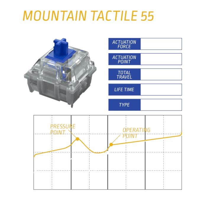 3-PIN PLATE MOUNT DESIGN Using an industry standard. MOUNTAIN Tactile 55 switches are compatible with all mechanical keyboards using Cherry MX style switches.