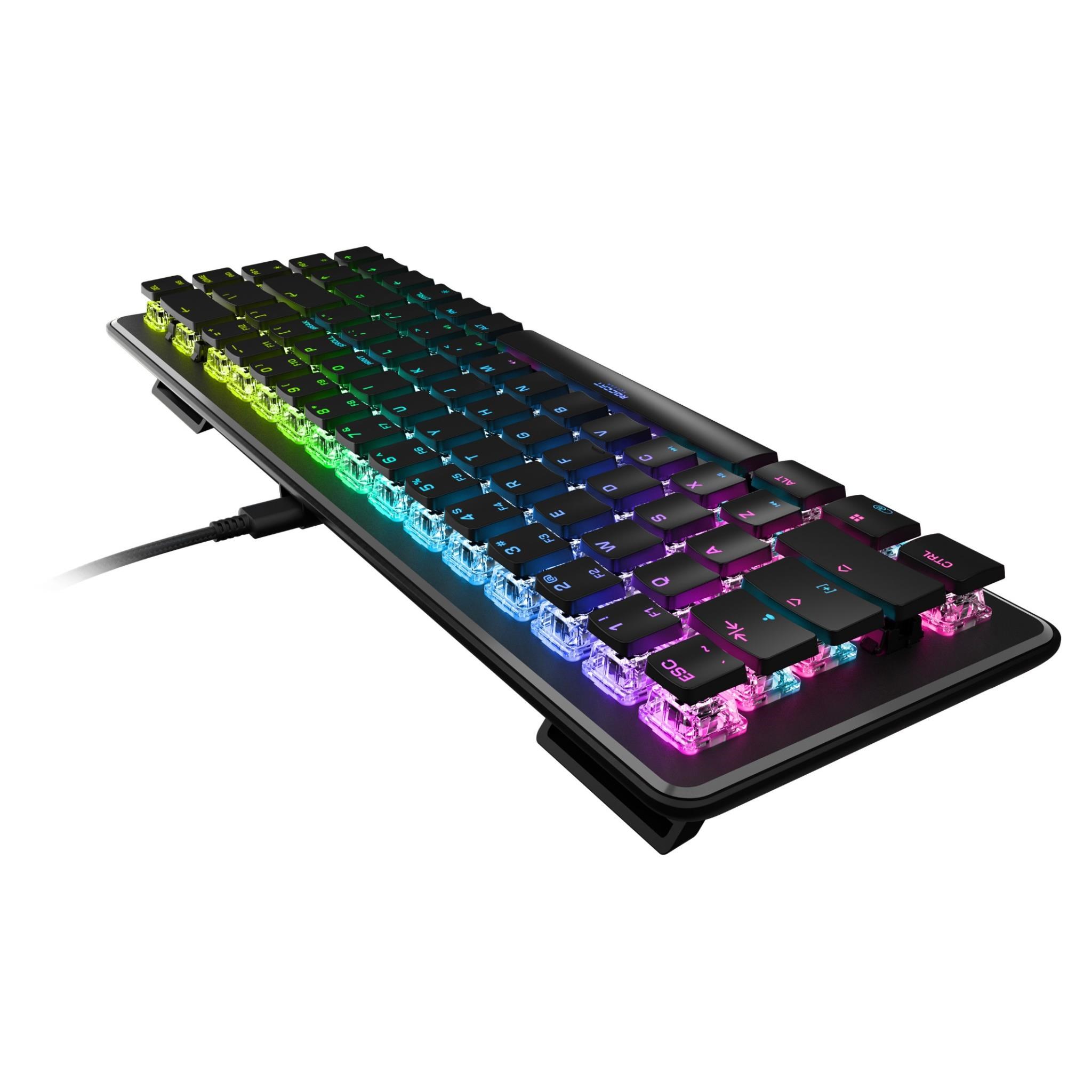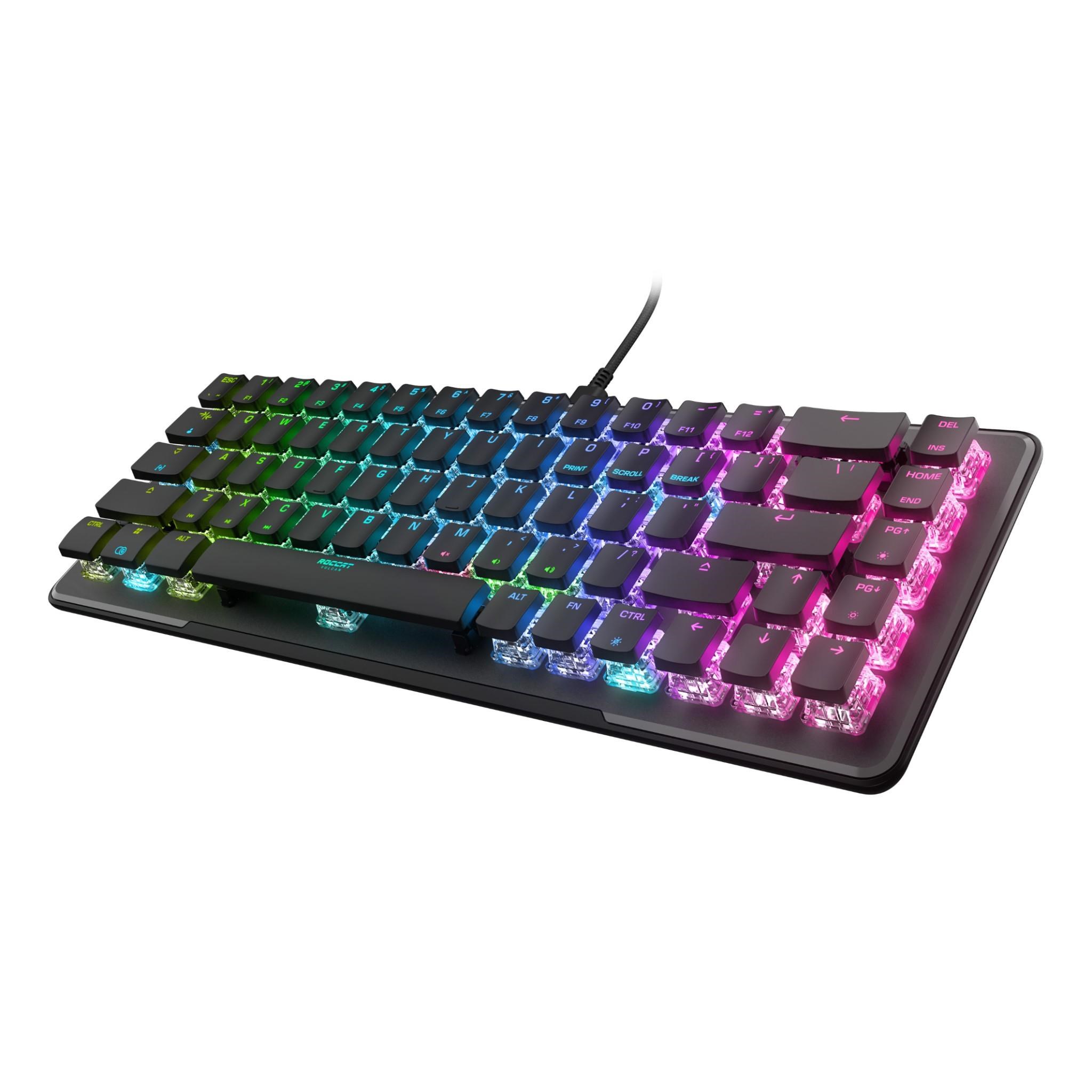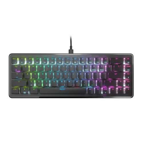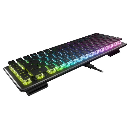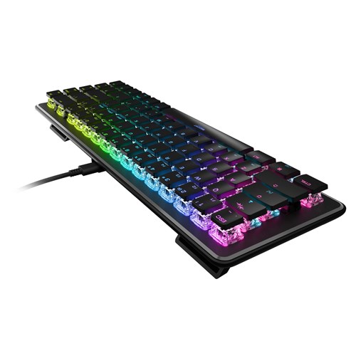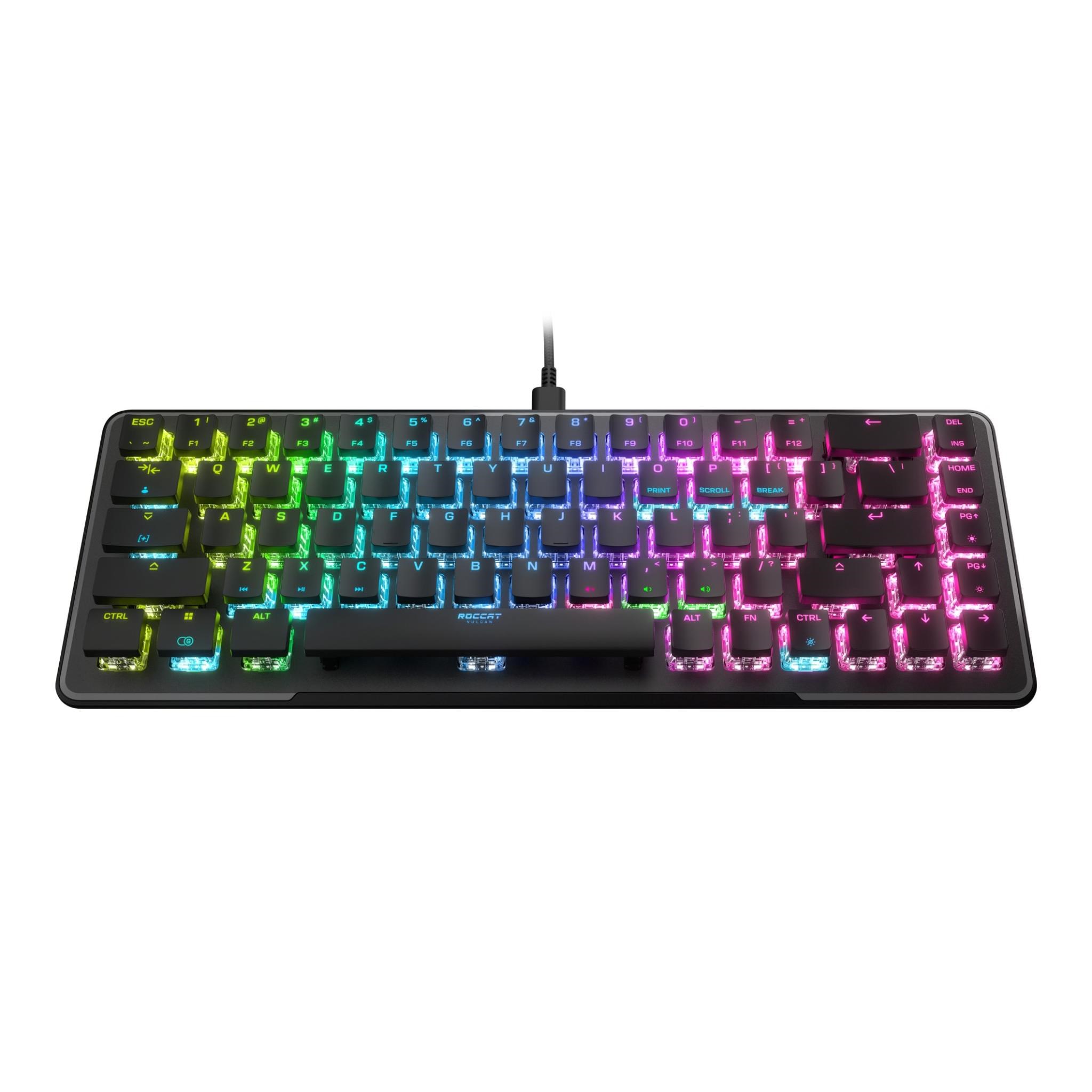 The Vulcan II Mini Optical-Mechanical Gaming Keyboard packs durability. performance. and functionality into a mini formfactor. At 65% of the size of standard keyboards. it provides ample room for large mousepads and sweeping mouse movements needed to win fast-paced games while retaining the arrow keys. making it the ideal addition to any gaming enthusiast’s arsenal. Exclusive TITAN II Optical Switches have linear. ultra-fast actuation and incredible durability with a 100 million keypress cycle. offering a competitive edge game after game. Enter game mode to access Easy-Shift [ ] button duplicator technology and unlock a second function layer which can be programmed into near limitless options.   Feel confident in your keystrokes with 30 multi-function smart keys featuring a dual LED to indicate when secondary functions are active. The USB-C cable can be easily detached and up to 5 profiles of custom lighting. key reassignment and more. directly on your keyboard providing convenient portability. The Vulcan II Mini’s anodized aluminum backplate reinforces its structural integrity and sets the stage for ROCCAT’s AIMO lighting technology which produces vibrant RGB lighting displays right out of the box and can sync with other compatible AIMO-enabled products for an immersive lighting display. Add a personal touch to your keyboard with third party cross shaped mount keycaps and USB-C cables.