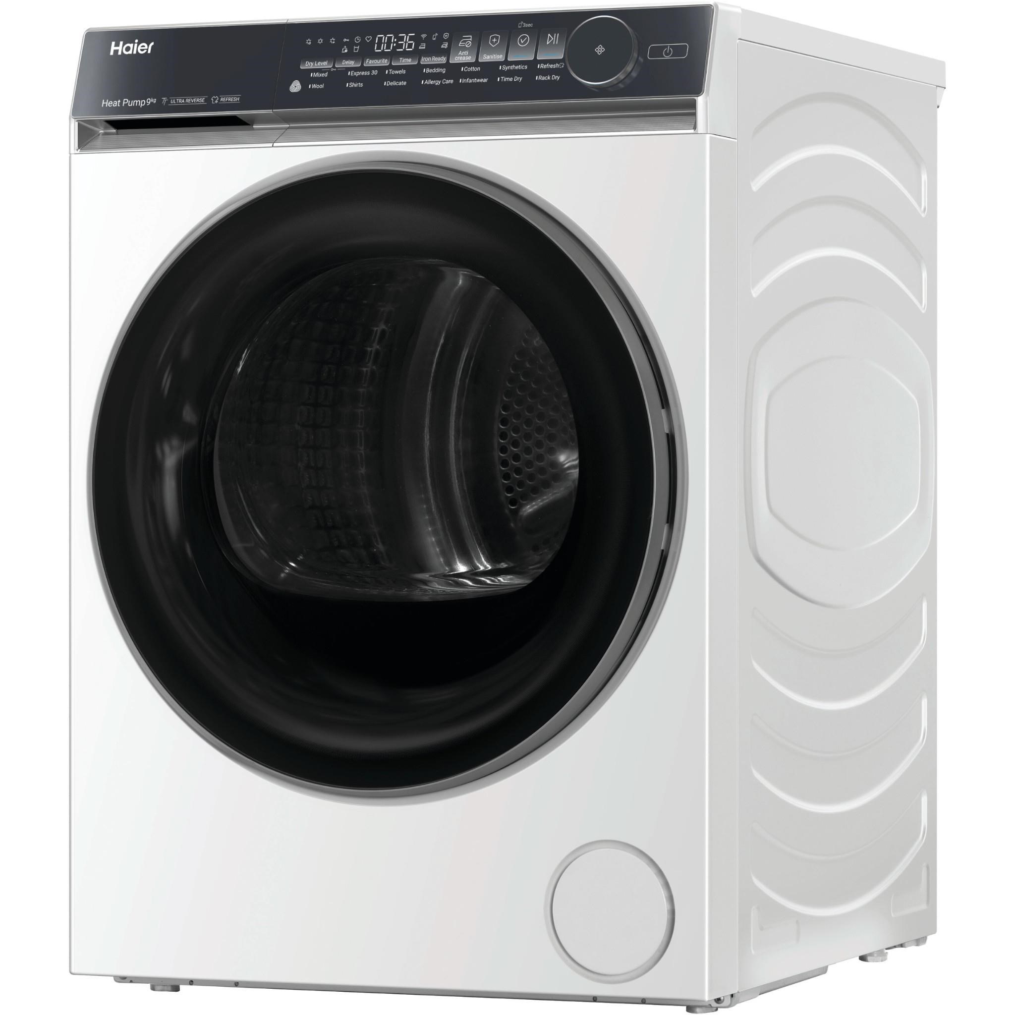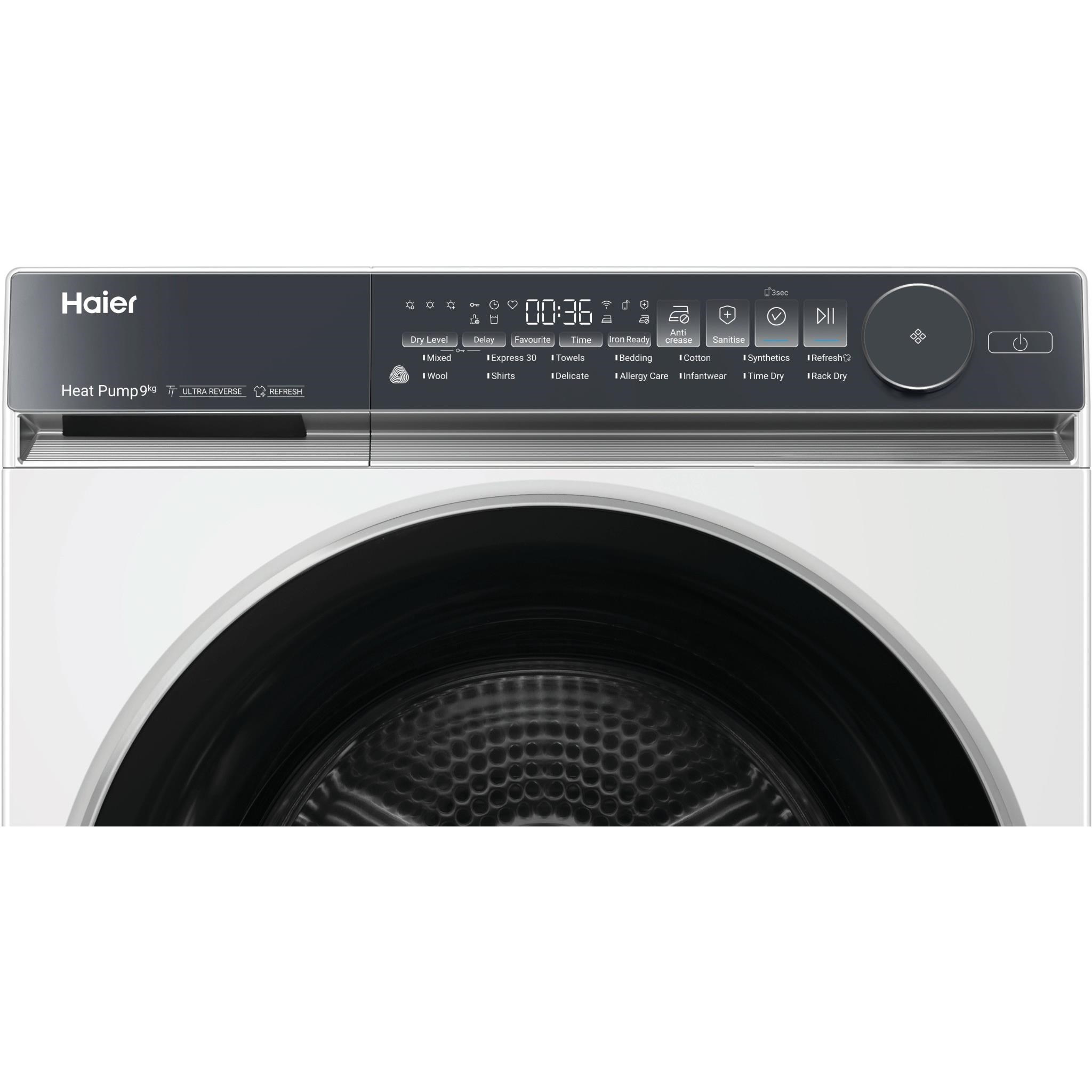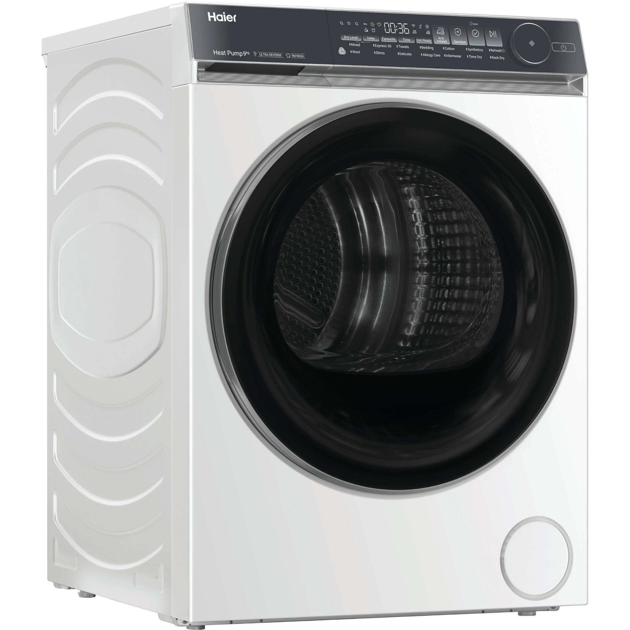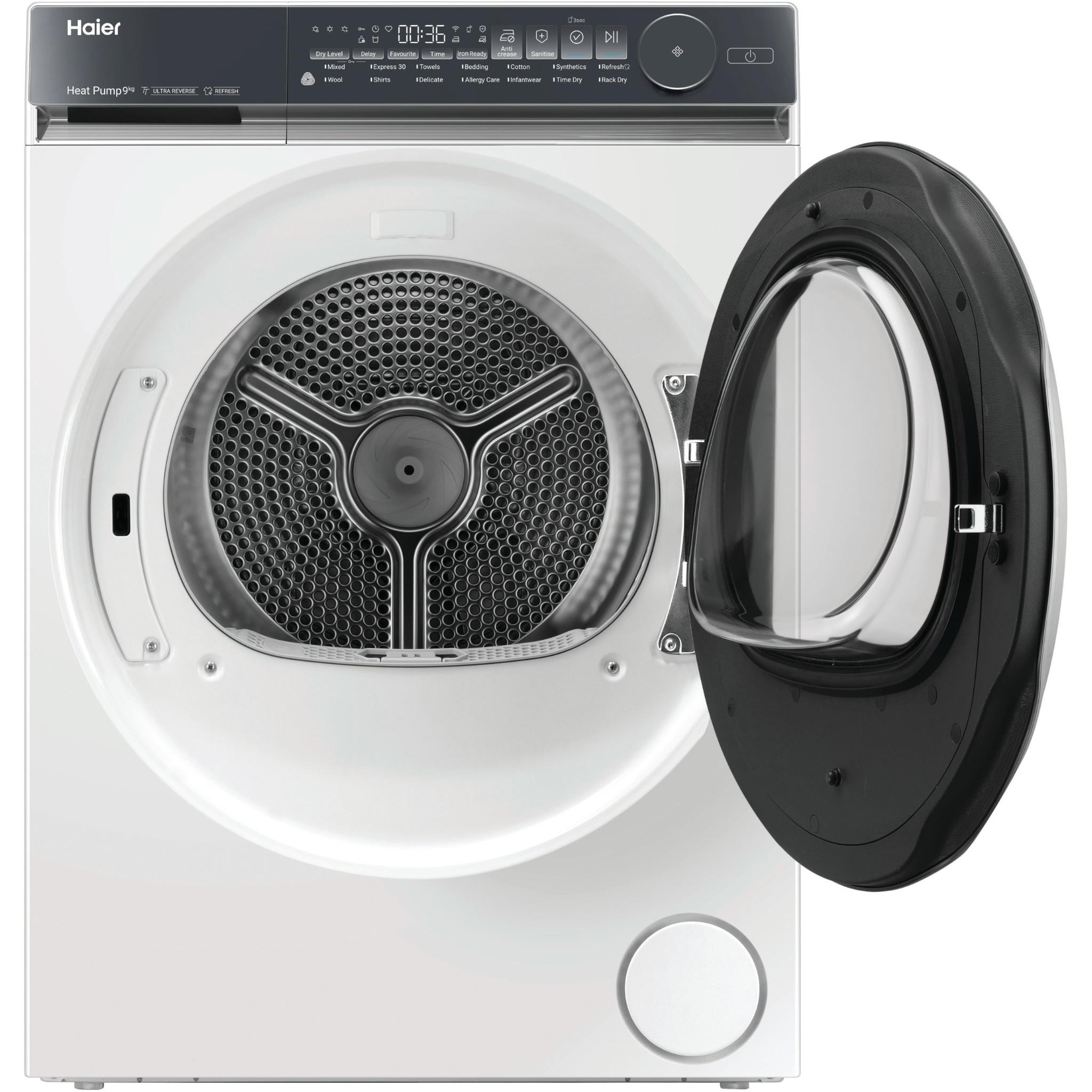 Keeping on top of your laundry and your energy bills can be tough. This spacious. 9-star energy rating dryer makes it easy. With its 9kg capacity it can handle all those big loads. and with Heat Pump technology recirculating air to dry clothes at a lower temperature. its better for your clothes and the planet. The only thing it’s designed to shrink is your annual running costs by up to 60%. compared to a vented dryer*. *Based on kWh consumption displayed in energy labels. electricity price of $0.25 per kWh and compared to Haier Vented Dryer HDV70AWW1.
