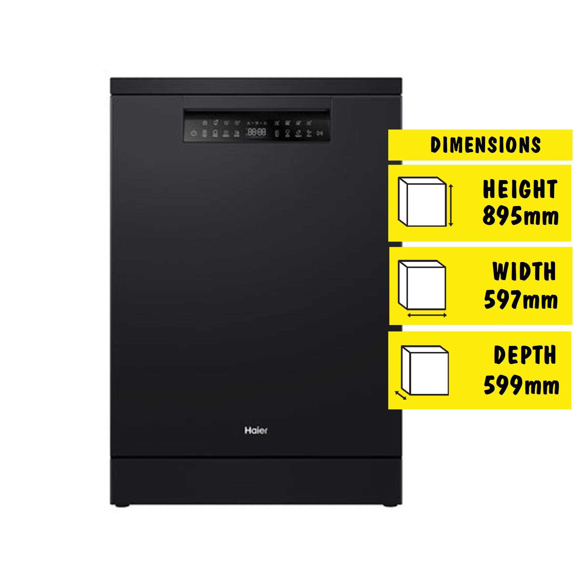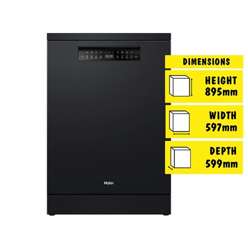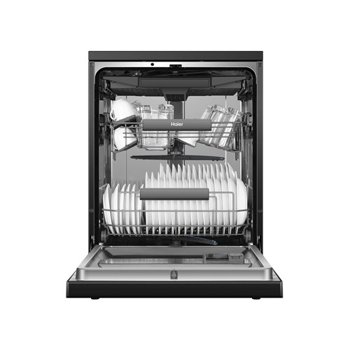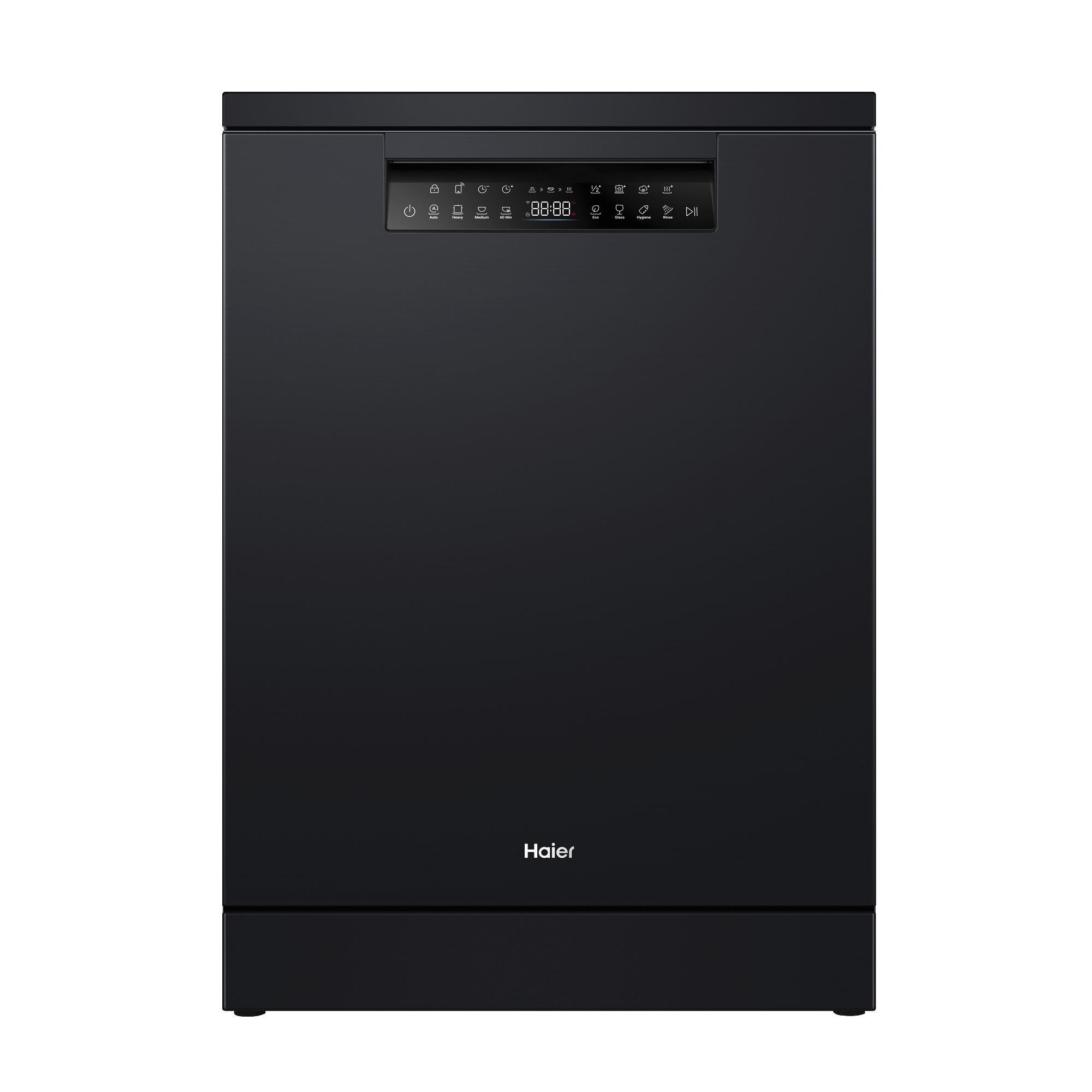 This dishwasher features modern styling in a black finish to match Haier refrigerators. The control panel is angled for easy reading. with touchcapacitive controls and a child lock.