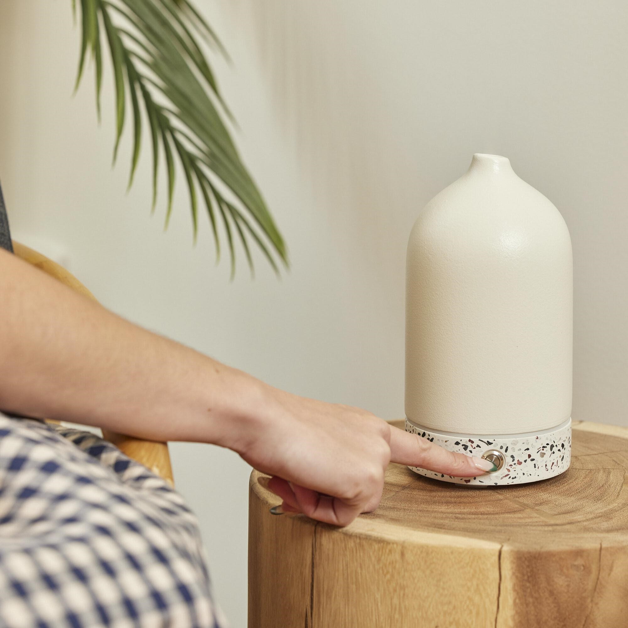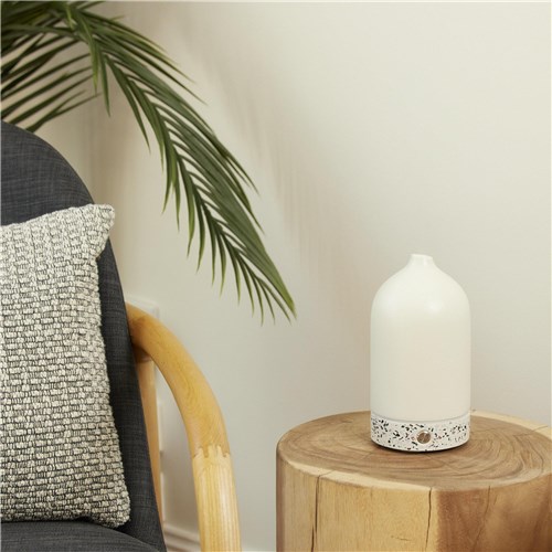 The Homedics Diffuser features a ceramic cover with Terrazzo base.  The Diffuser gently lifts the scent of your favourite essential oils into the air to transform the mood of your space. The Diffuser delivers up to 7 hours of continuous use.  It features a Warm white light for a gentle ambiance.