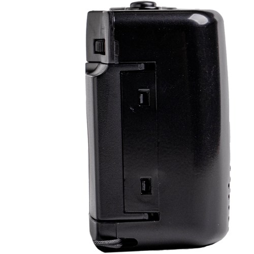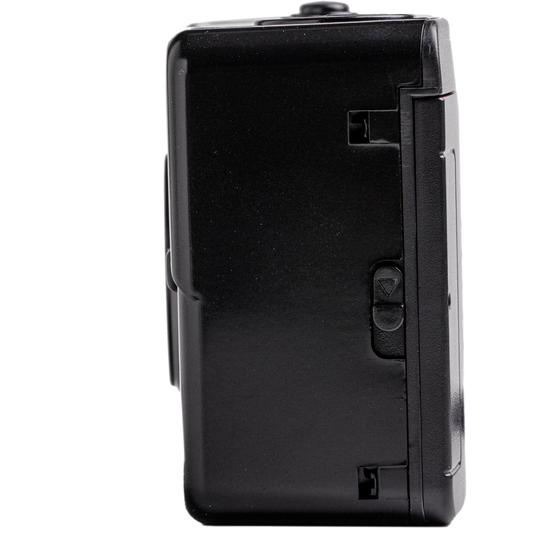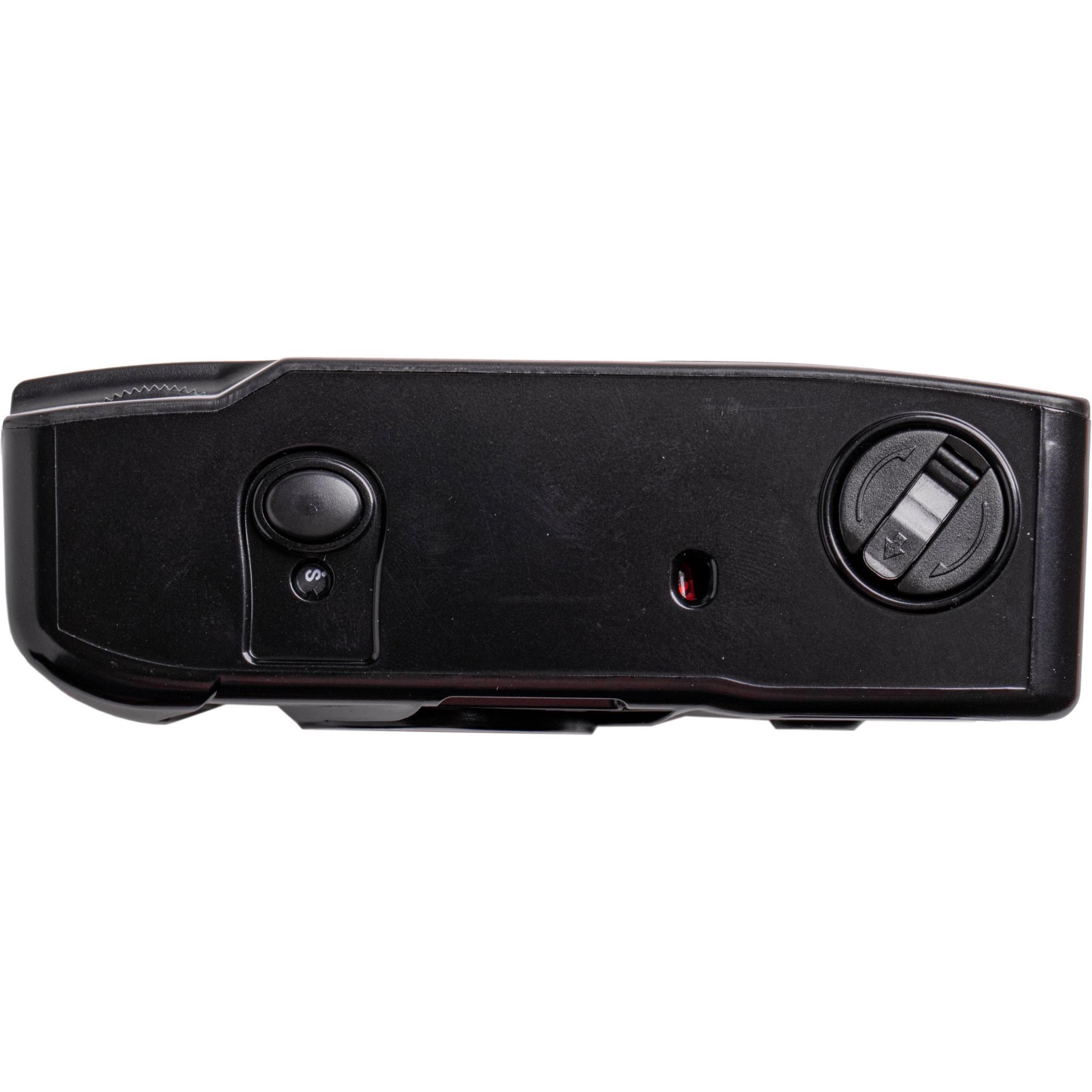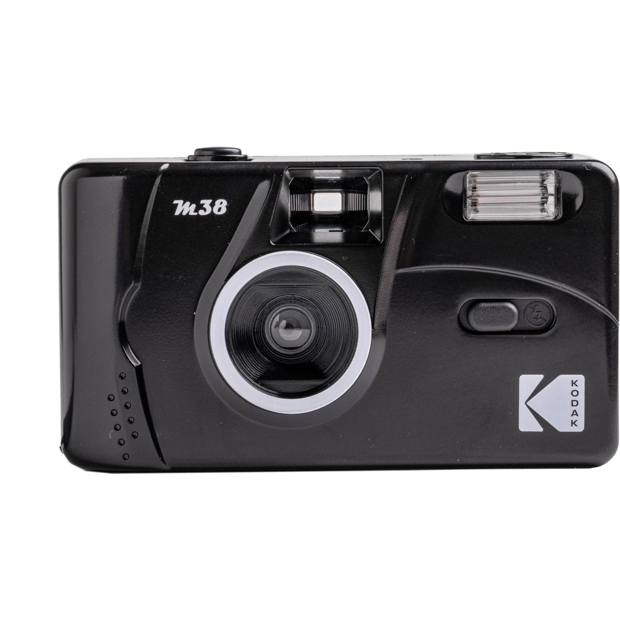 Capture the memories. The M38 35mm Film Camera with Flash in Starry Black from Kodak is a small reusable film camera with built-in flash. This camera has a fixed focus lens. manual film winding and rewinding. and an on/off switch for the flash. It conveniently runs on one AAA alkaline battery and takes 35mm film.*