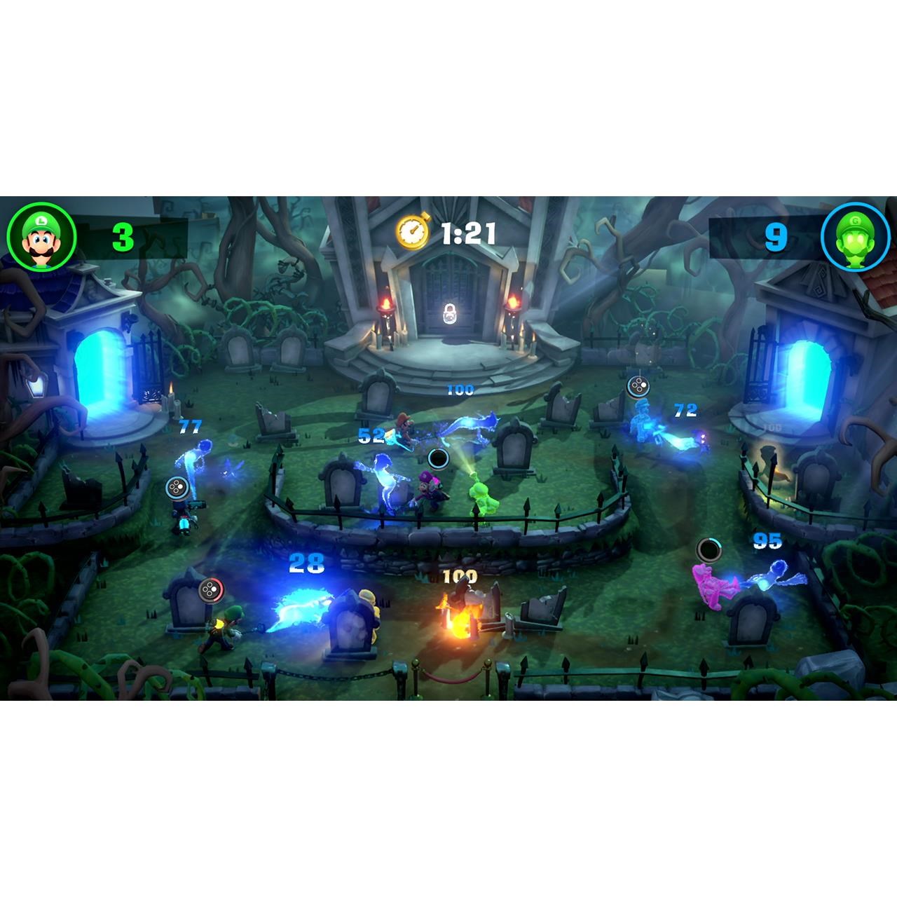 For more frenetic multiplayer action. race the timer to clear various objectives on a series of floors in ScareScraper mode. ScareScraper mode can be played online or locally with up to eight players on four Nintendo Switch systems.