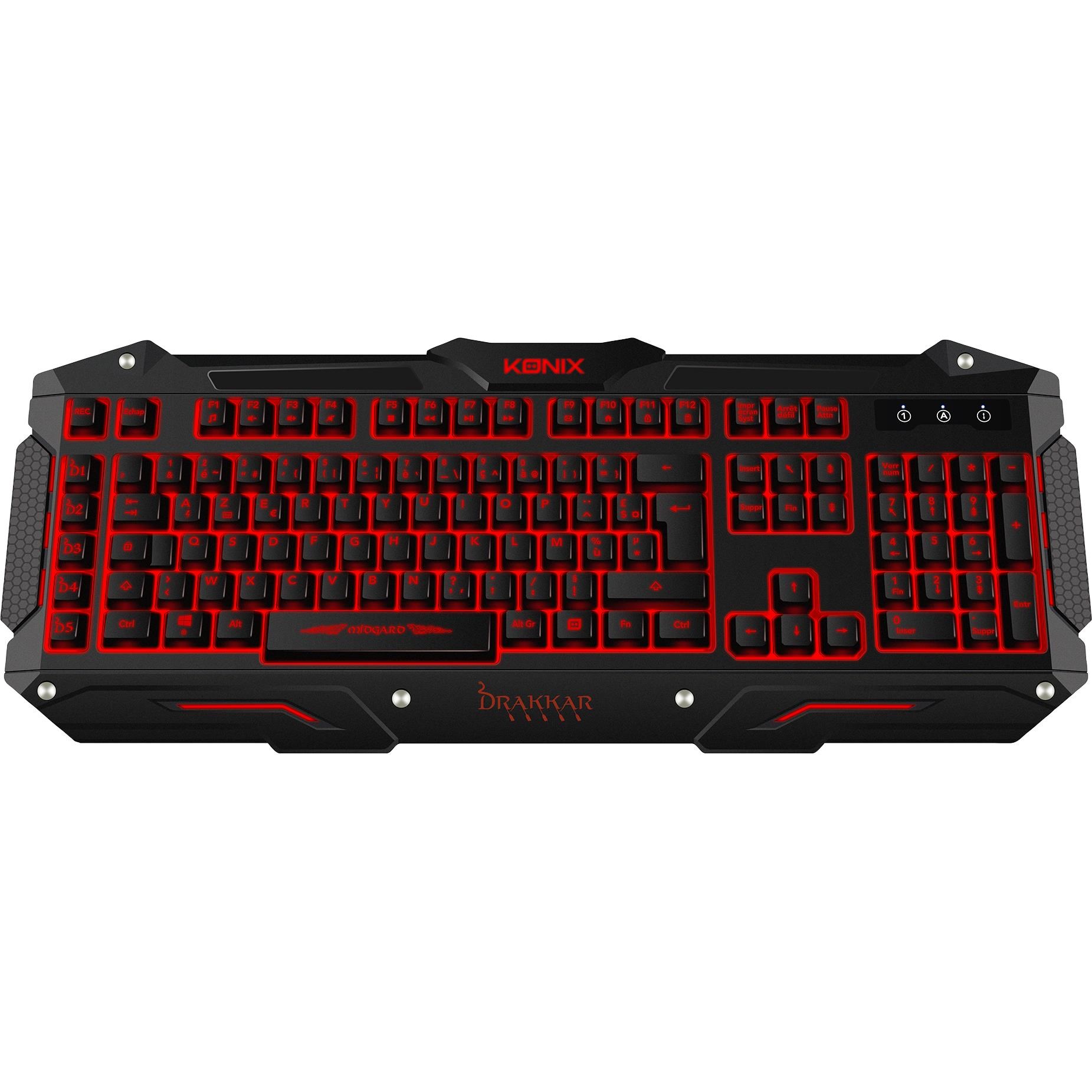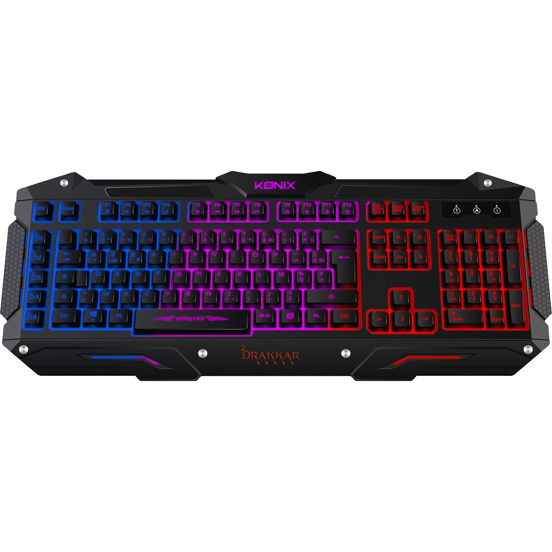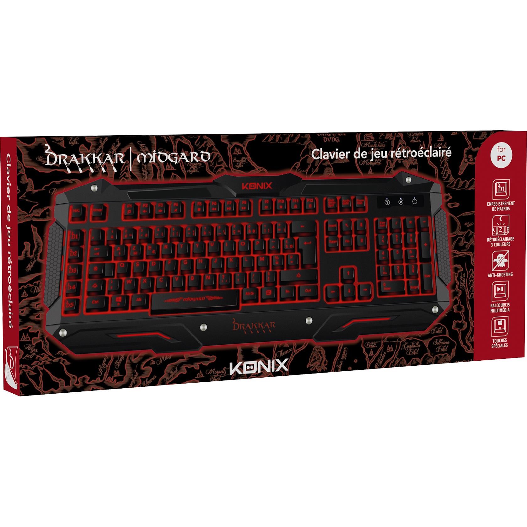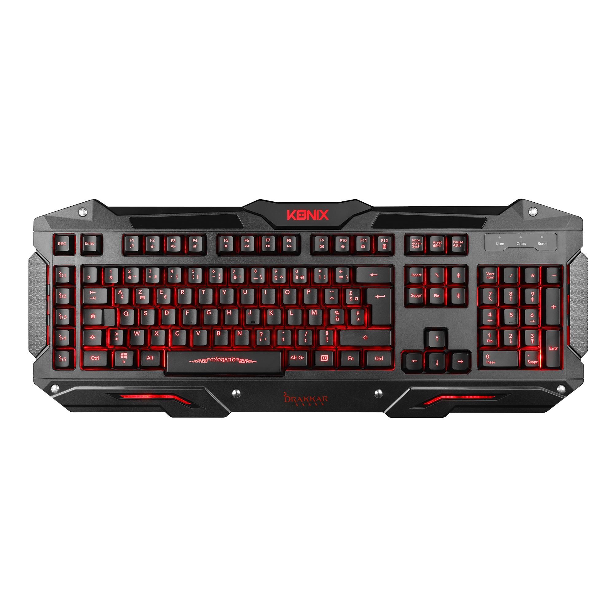 Designed for gamers. the Konix Drakkar Midgard has all the ingredients for maximum enjoyment: ease of use. design. and ergonomics! The keyboard features five programmable keys. which allow you to save macros during play and execute complex key combinations a single press of a button. And that’s not all: the Konix Drakkar Keyboard has backlit keys so you can play at night!