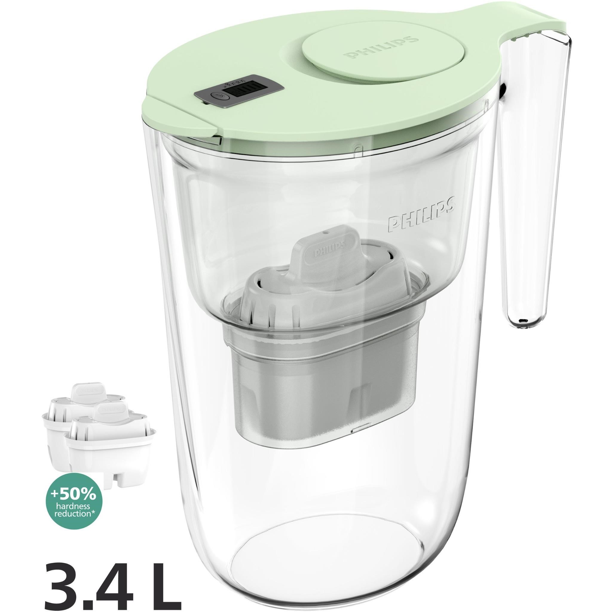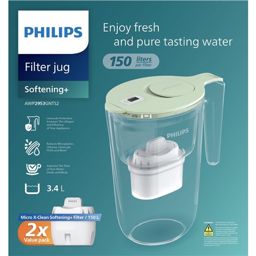 More ion exchange resins. Philips Micro X-Clean Softening+ filter offers enhanced water softening performance for hard water areas. which provide you crisp and pure tasting water and flavourful hot and cold drinks. as well as helps to prolong the life of your kettle by preventing limescale build-up. Digital timer reminds you when to replace the filter for the best result. Flip top lid for single-handed refill. Dust-proof spout keeps water fresh and clean by preventing dust from getting in through the water outlet. Prolongs the lifetime of kitchen appliances by preventing limescale build-up. Great-tasting water at a fraction of the cost and waste of bottled water.