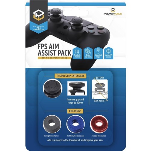 The Powerwave PS4 FPS Aim Assist Pack will give you the competitive edge in gaming with the ability to improve aiming stability and accuracy. Choose from Hard. Normal or Soft Aim-Rings to provide customised support and make precise. fine movements in your favourite Action and FPS games. For even more customisation add on the concave design Thumb Grip Extenders for enhanced grip and range by 10mm