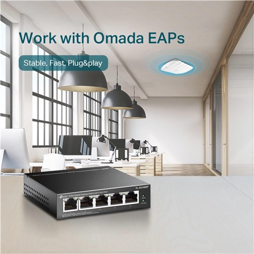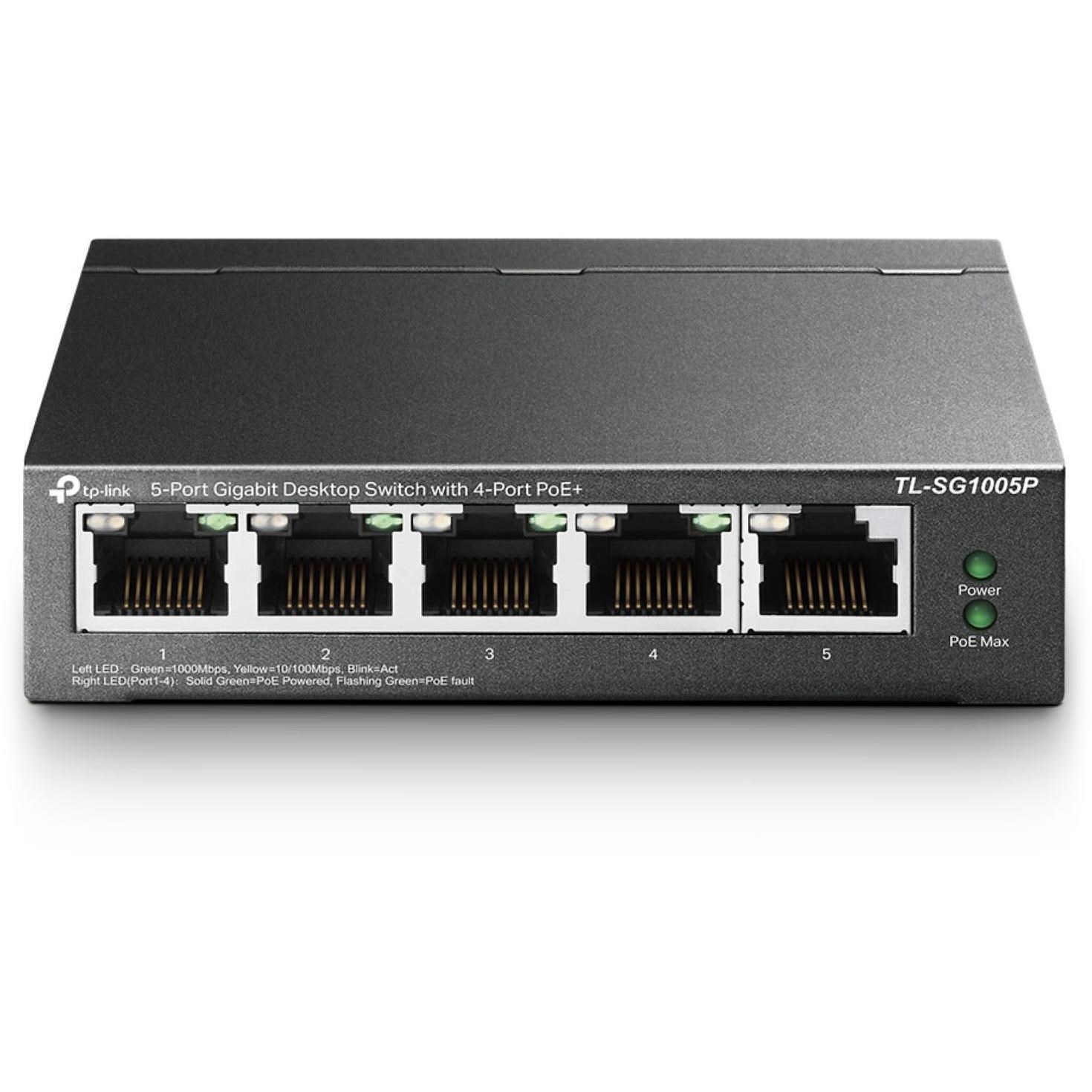 TL-SG1005P is a 5 10/100/1000 Mbps ports unmanaged switch that requires no configuration and provides 4 PoE (Power over Ethernet) ports. It can automatically detect and supply
